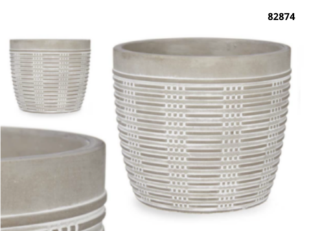 Maceta cemento rayada redonda 13,5×13Plato cemento con relieve mimbre fino